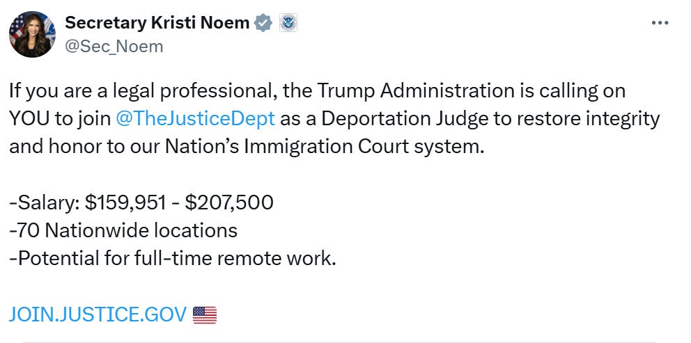 Immigration along with low birth rates is a significant part of the changing demographic picture. If your goal is to keep America white, curtailing immigration is the most obvious step (but note that they are also trying – and will fail – to raise birth rates, too). And recasting the role as “deportation judge” for the purpose of recruitment is a good way to skew the hiring pool your way.